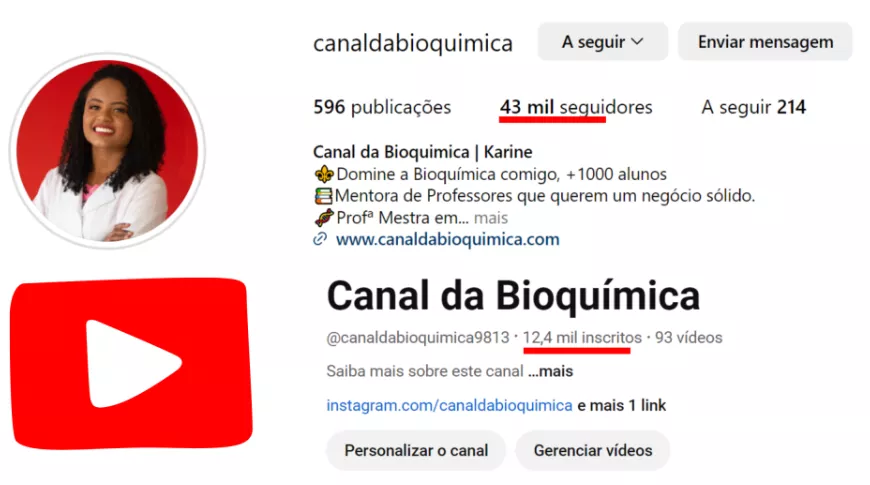 Há quatro anos, fundei o Canal da Bioquímica e desde 2021 entendi que deveria centrá-lo em torno de um ponto: a produção de conteúdo. Com essa ideia, alcancei mais de 40 mil seguidores no Instagram, mais de 12 mil inscritos no Youtube e mais de 1000 alunos dentro das minhas plataformas digitais. Nos links abaixo, você pode conhecer melhor as minhas redes sociais.